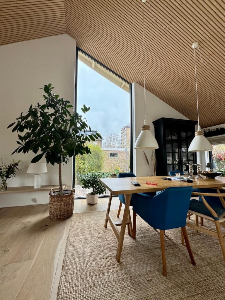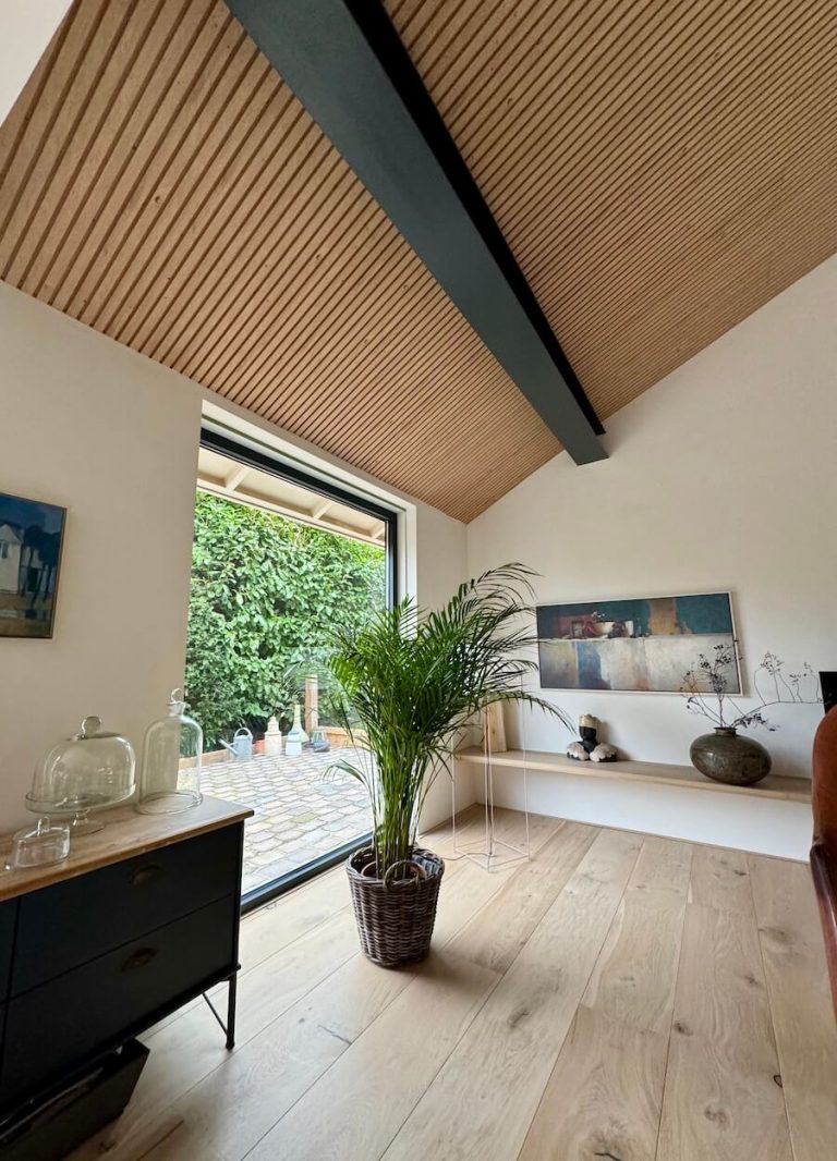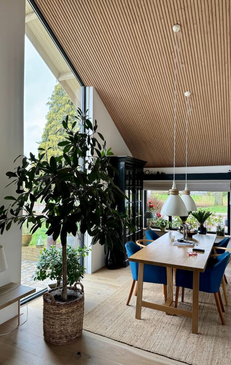 De enorme blikvanger van de bungalow is het nieuwe, enorme raam aan de zijkant van de woning. Het werd nieuw geplaatst en het glas reikt van het puntje van het dak tot de vloer. Het levert een enorme hoeveelheid licht op in de woning.