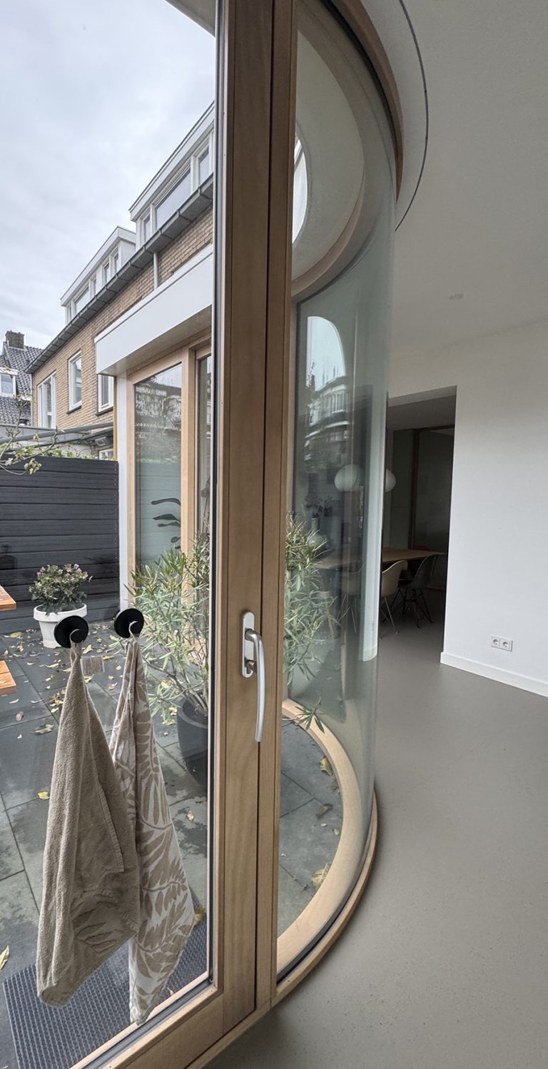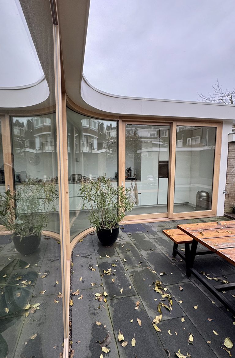 De uitbouw is ontworpen door de architecten van De Ontwerpbar. “We wilden een stuk uitbouwen maar ook een groot stuk tuin overhouden en tegelijkertijd het maximale aan licht binnenlaten’” vertelt Bart tevreden aan de keukentafel. De speelse vorm van de uitbouw met een rond gebogen pui maakt het ontwerp speels en bijzonder.